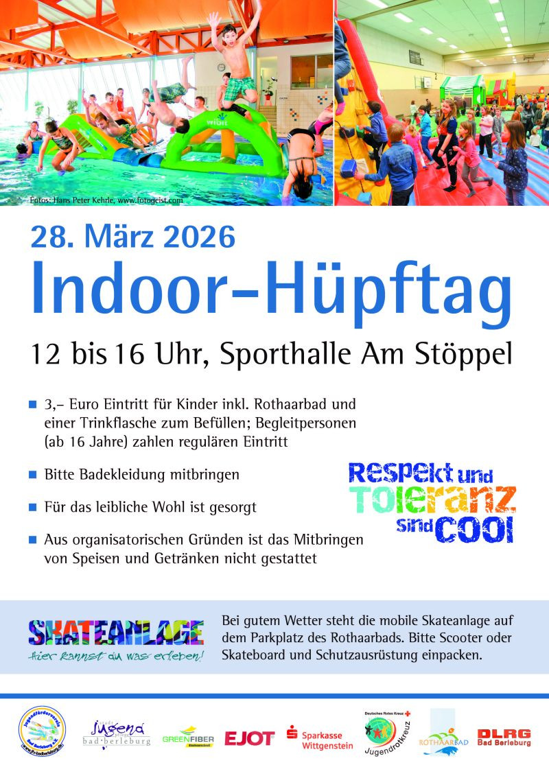 Am 28. März verwandelt sich die Turnhalle auf dem Stöppel und das Rothaarbad in Bad Berleburg wieder in den größten Indoor Spielplatz Wittgensteins. Von 12 bis 16 Uhr können sich die kleinen Gäste wieder austoben. In der Sporthalle stehen unzählige Spielgeräte, Hüpfburgen bereit. Im Schwimmbad wartet wieder ein Wibit-Parcour und jede Menge Spiel und Spaß auf die Besucher.